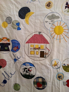 Quello di destra viene dalla Francia dalla mia amica missionaria Cheryl, è un pannello interamente quiltato a mano intorno ad ogni forma e rappresenta un piccolo villaggio con le sue case, strade etc., l'alro è di Anna di Mestre (VE) che quando l'ha cucito era alla sua prima esperienza di quiltatura a macchina, ha usato un "charm pack"(pacchetto di stoffe pretagliate a quadrati) e l'ha incorniciato con tessuto bianco.