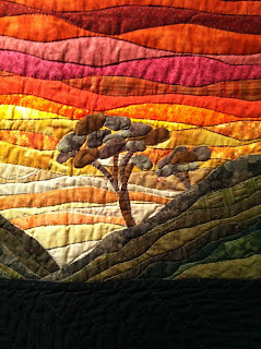 I lavori esposti erano quelli piu' recenti, si comprende dai tessuti usati, dalla lavorazione maturata nel tempo di "palestra" con l'ago e i fili che spesso parlano insieme alle forme, cosa che spesso non succede nella tecnica dell'applique' in quanto il filo generalmente e' silenziosamente presente senza disturbare i soggetti "protagonisti" e nella innovazione del design, che interpreta in modo molto spontaneo.